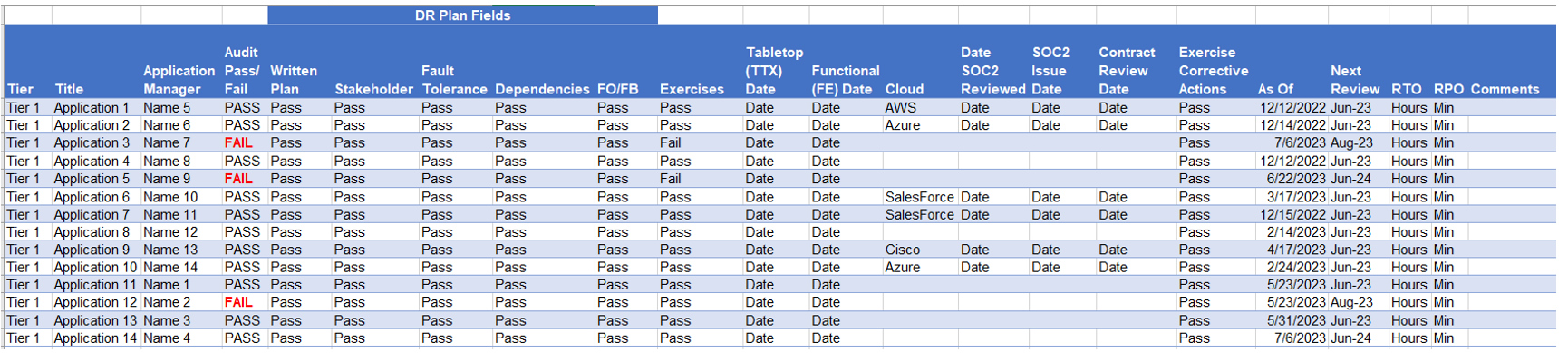 These fields from the DR plan then populate in a pass/fail state in the Disaster Recovery Scorecard (DRSC), resulting in a view like this (modified to protect the innocent):